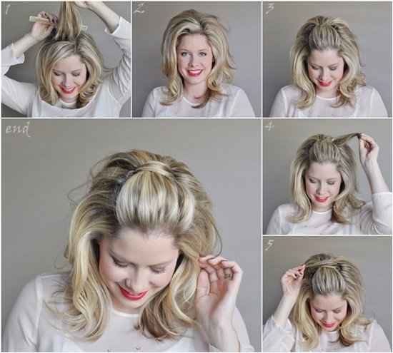 - Нужно приподнять волосы и у корней сделать небольшой начёс расчёской с тонкими зубцами. Пряди следует убрать назад, закрепив невидимкой или любой заколкой.
