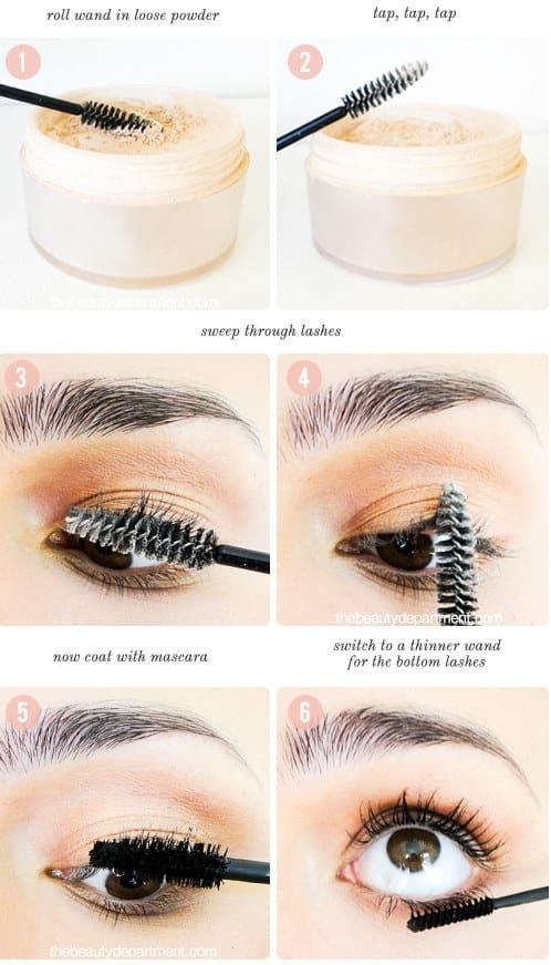 Для этого нужно сначала накрасить косметическое средство, потом плотным слоем кистью нанесите пудру по всем ресницам, делать это нужно, пока тушь еще не высохла. После этого дополнительно нанесите раствор на пудру, чтобы получить визуально пышный и густой результат. Использовать способ лучше только на верхнем веке, так как на нижнем это будет смотреться слишком объемно и неестественно.