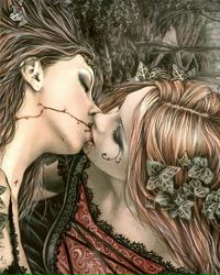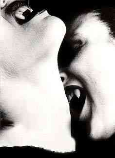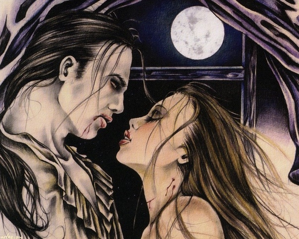 Предположим мы попали в неловкую ситуацию и стали вампиром. Незадача – не видим себя в зеркале! Попробуем нарисовать по памяти, но пока поучимся это делать получше. Итак, суровый взгляд, невинная жертва и поцелуй! Рисуем поцелуй вампира по шагам.
