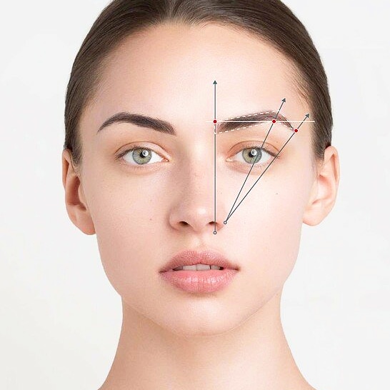 Для расчета самой высокой точки брови линию проводят от носа к внешнему краю радужной оболочки до пересечения с линией бровей. Завершающая точка находится на пересечении с бровью, если линию провести от носа к внешнему краю глаза.