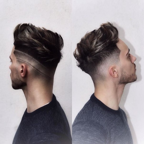 Их парни заимствуют у своих подружек. Такой способ примечателен тем, что рисунок отлично смывается и помогает добиться точности узора. - Последний этап мужской стрижки с коротким затылком заключается в том, что отделенная зона волос вычесывается вверх — ровно или с оттяжкой в сторону – и обрезается прямой линией.