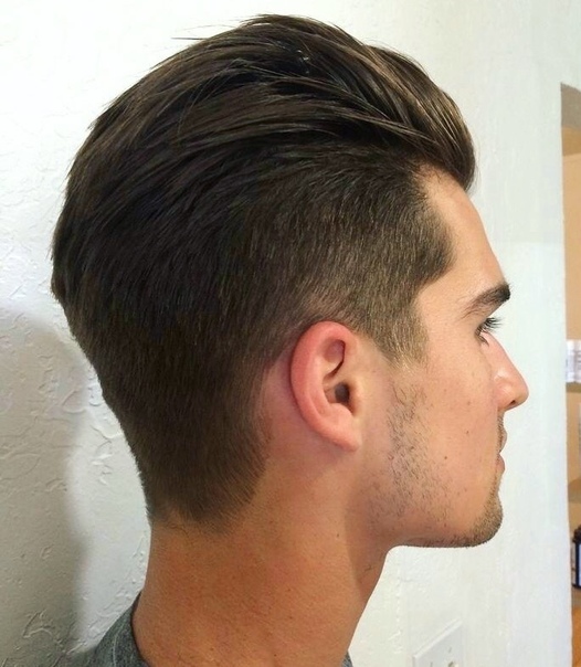 Чтобы ее сделать, потребуется отделить любым описанным ранее способом теменную зону. А после состричь плавный переход с висков к нижней части затылка. Выделенная прядь волос в некоторых случаях остается без изменений. Хотя при желании ее можно постричь с оттяжкой к макушке. Тогда получится мужская короткая стрижка с челкой и длинным затылком.