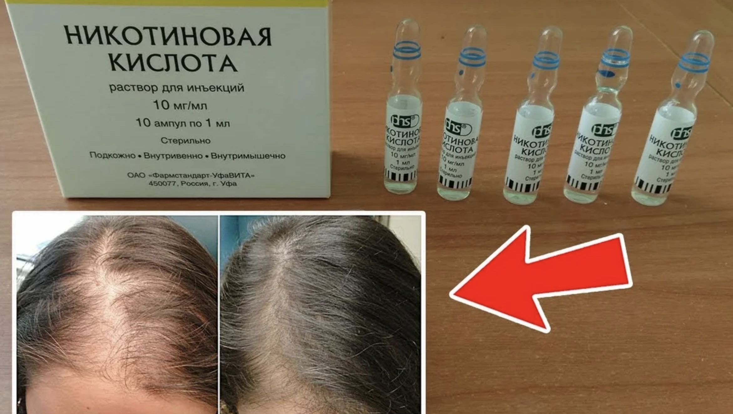 - Внутривенные инъекции никотиновой кислоты способствуют укреплению и быстрому росту волос.