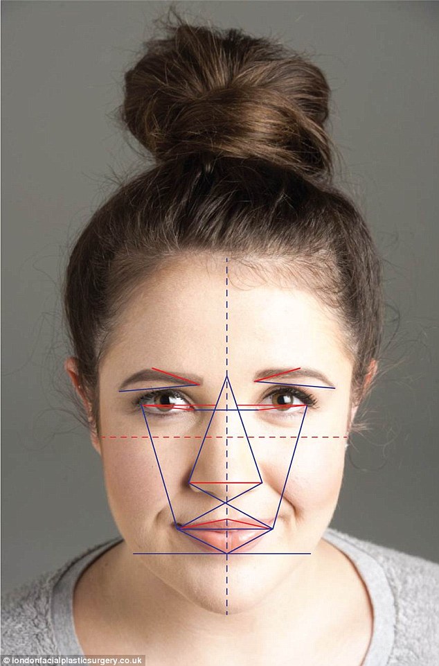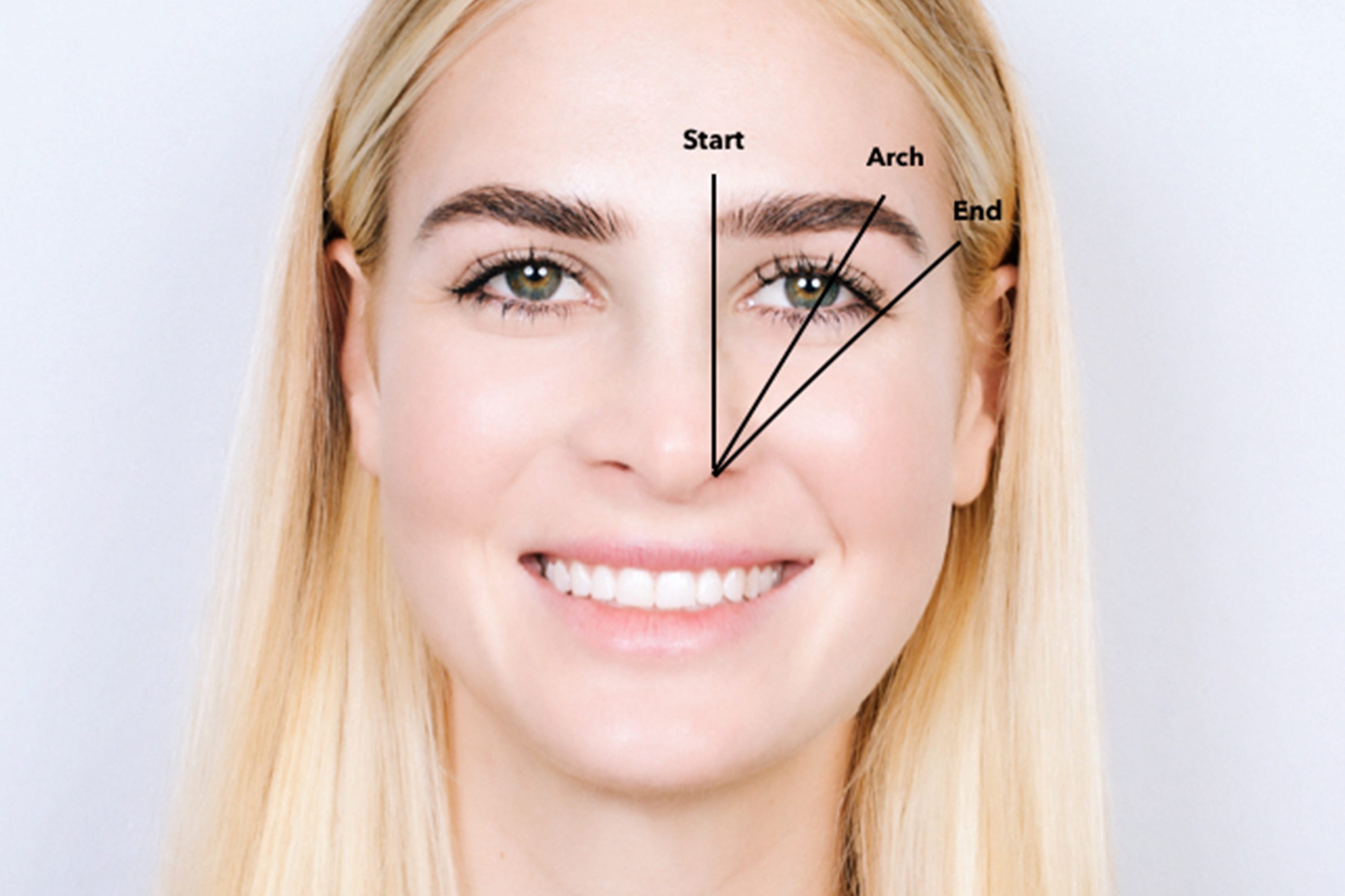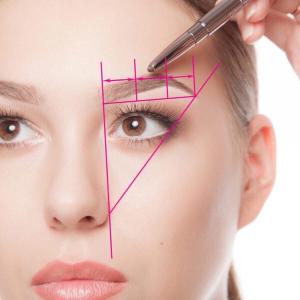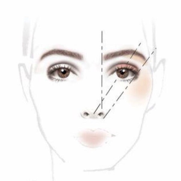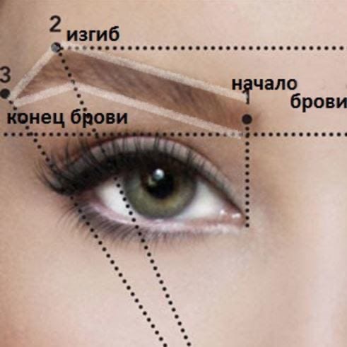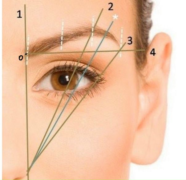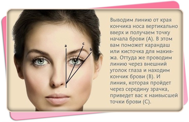 Дуги совпадают с ноздрями и зрачком глаза, а кончик брови совпадает с краем носа и нижней линией ресниц.