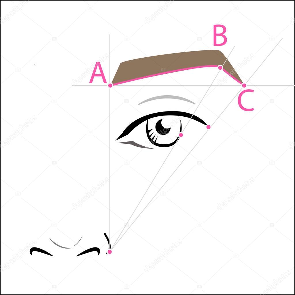 Чтобы правильно разметить брови, требуется выделить точки начала брови для покраски, место излома, внешний угол, нижнюю линию и окончание.