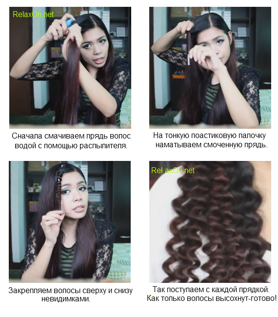 Первый из них очень прост: высушенные волосы скрутите в тугой жгут и проведите по нему горячим утюжком несколько раз. Аккуратно разделите волосы пальцами, не расчесывая, закрепите лаком.