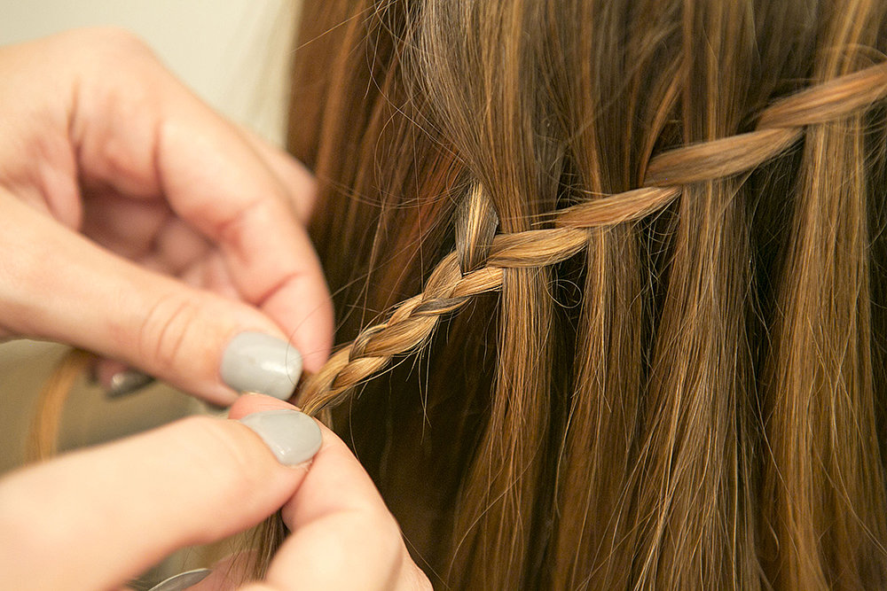 - Добавьте секции водопада к своей косе . Осторожно соберите пряди волос, которые падают через косу, и объедините их в косу сзади.