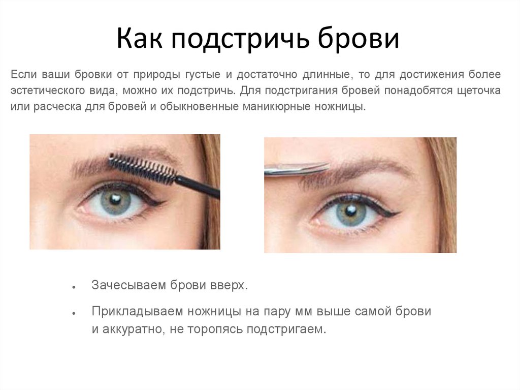 Волосы на бровях не обязательно должны быть одинаковой длины, но если ваши брови выглядят так, как будто они растрепались по верхнему краю, решение состоит в том, чтобы их подстричь. Используя щеточку для бровей или катушку (в основном, чистую палочку для туши), Бейли советует расчесать волосы вверх к линии роста волос и к виску.Острыми острыми косметическими ножницами обрежьте кончики волос, которые растут за «материком» вашего лба. Не торопите процесс. Если вам нужно подстригать по одному волосу за раз, переустановить бровь на то, как вы их носите естественным образом, а затем снова подтянуть волосы для следующих волос, сделайте это! Практика ведет к совершенству.