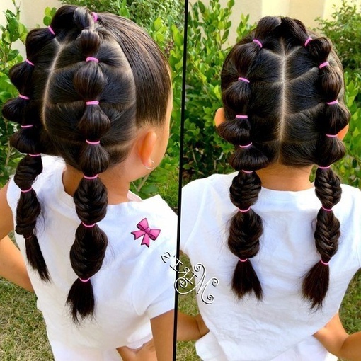 Если разделить всю часть головы проборами на равные участки, и из каждого заплести простые косички, то здесь можно также применить фантазию. Их можно соединить все между собой в один хвост или же в несколько. Скрепить их все с одного бока или сзади, тут уж ваше воображение пусть само даст волю вашим фантазиям. Только не увлекайтесь, чтобы не замучить ребенка, не отбить тягу к прекрасному у дочери.