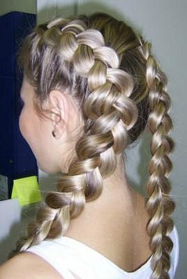 Разделите ее на три секции и начинайте заплетать традиционную трехпрядную косу.- На втором-третьем проплете добавляйте свободные локоны с обеих сторон. Будьте внимательны, чтобы обе косы располагались на одном уровне.