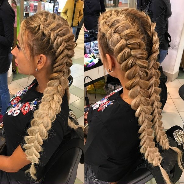 Идеально вылепленные французские косы в этом хвосте выглядят почти как произведения искусства. Густая коса, проходящая через верхнюю часть прически, и обратная коса на нижней стороне идеально сочетаются.Яркая платиновая блондинка идеально завершает образ и вызывает у нас невероятную зависть.