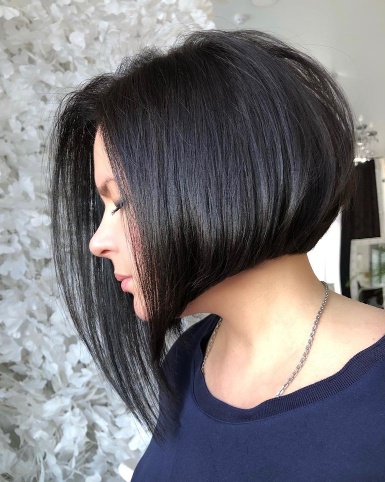 Вид сзади такой несимметричной стрижки просто великолепен! Спереди вы увидите те же различия в длине. Здесь передняя часть касается подбородка на более длинной стороне и чуть выше уха на более короткой стороне.