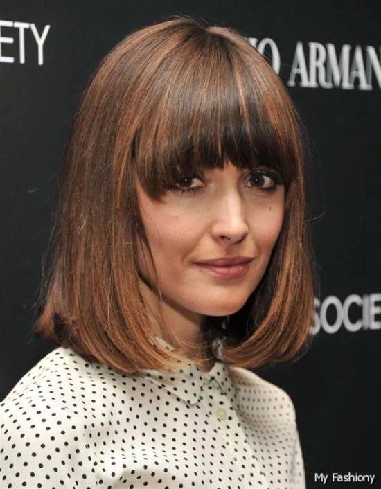 Это немного другая стрижка боба, при которой волосы спереди распределяются по лбу, а сзади и по бокам подстригаются до одинаковой длины.