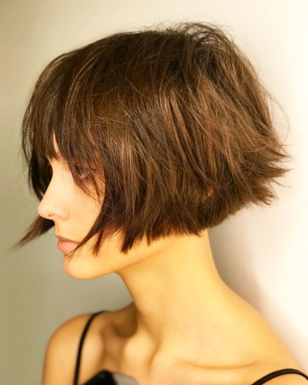 Рваные короткие прически с челкой ниже уровня глаз выглядят дерзко. Фото: indigitalimages.com Если полная челка требует слишком много усилий, челка с бахромой, зачесанная на одну сторону, будет более легким вторым вариантом. В то время как это выглядит потрясающе на более длинных прическах, боковая челка, которая обрезана, тупая и изменчивая, выглядит одинаково потрясающе на более коротких прическах. Чтобы сделать прическу пикси, лоб или боб более объемной, попросите своего стилиста сделать челку с бахромой, которая падает чуть ниже глаз.