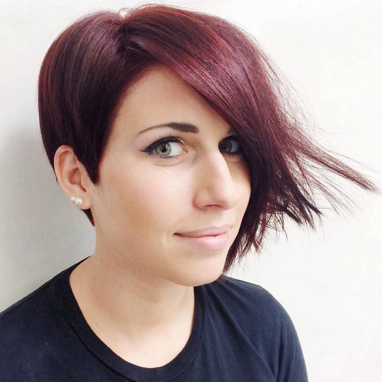 Если хочется создать очень экстравагантный образ, следует поэкспериментировать со следующей стрижкой. Единственный нюанс заключается в том, что лучше всего она смотрится на темных волосах. Поэтому смелые, самоуверенные и знающие себе цену брюнетки обязательно должны ее попробовать.