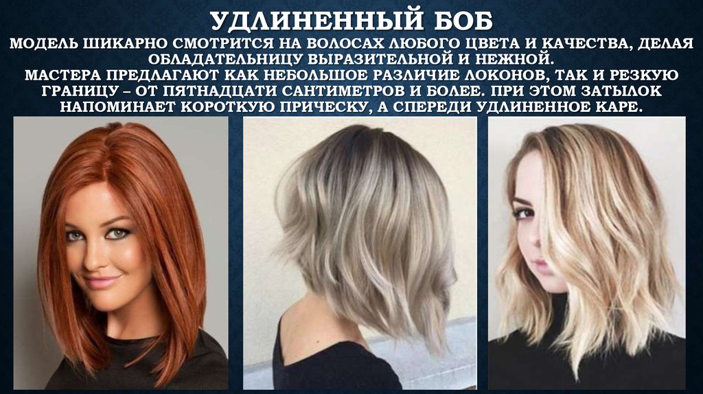Стрижка с удлинением отличается от классической более выраженным переходом длины. Передние пряди сбегают к подбородку и еще ниже — так, чтобы с одной стороны волосы обрамляли лицо, а с другой — еще опрятнее была спина.