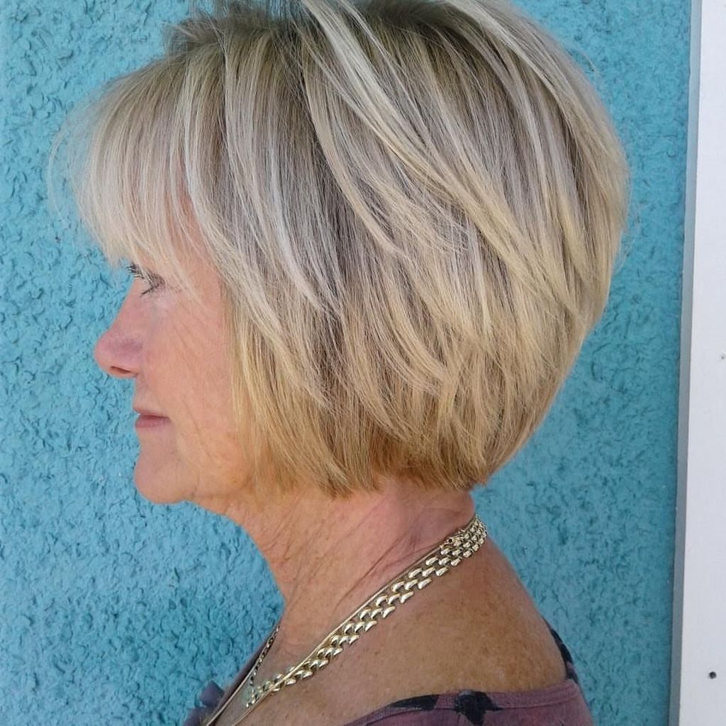 Стильный боб. Этот вариант прически после 50 лет нужно подбирать с учетом особенностей волос, их структуры, типа, состояния и объема. Существует немало разновидностей стрижек боб, которые отличаются по длине и форме. Такой образ легко «избавит» обладательницу от нескольких лишних лет и в то же время придаст элегантности, строгости и деловитости. Все зависит от вариантов укладки. Эта прическа легка в уходе и отлично украшает женщину в возрасте.