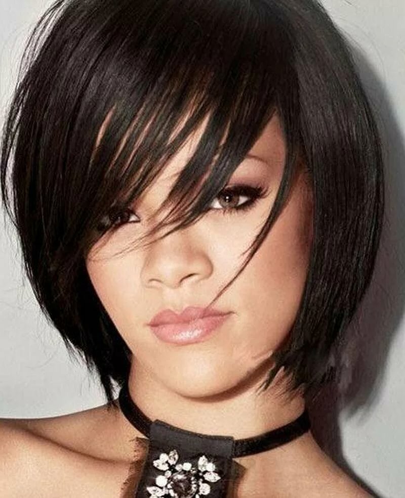 Это вариант для смелых девушек с идеальными пропорциями и чертами лица. Короткая челка сильно выделяет глаза и нос. Она будет удачно подходить к короткому каре (тип «боб» или «на ножке»). Укладку, подходящую для подобного каре с челкой, фото прекрасно показывает. Сразу видно, что с такой стрижкой приемлемо только выпрямление и сильная фиксация формы.