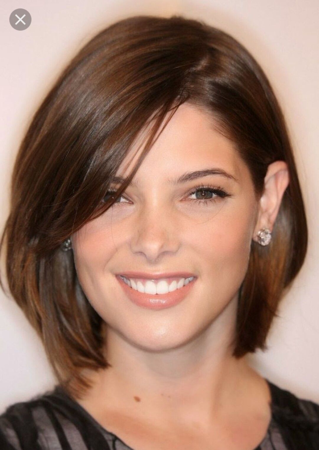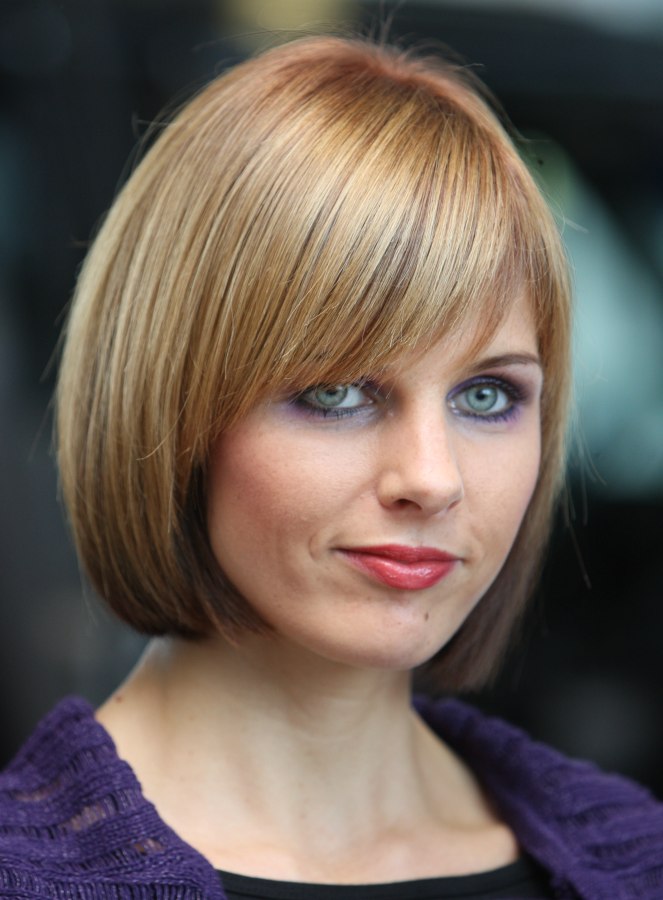 - По мнению большинства парикмахеров, каре с косой челкой лучше всего подходит именно обладательницам овального или круглого личика.