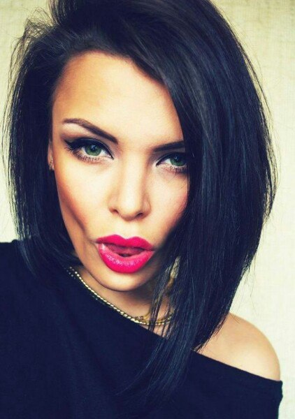 6) Короткое каре с удлиненными передними прядями. Подходит всем, но особенно удачно смотрится на девушках с квадратной формой лица. Данная стрижка отлично маскирует грубые линии скул, а также чересчур массивный подбородок.