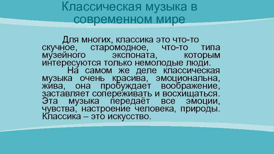 Ограничившись здесь примерами из популярных классических произведений, не будем забывать, что современная, народная, эстрадная, джазовая – любая музыка, тоже имеет опредёленный характер, даря слушателю соответствующее настроение.