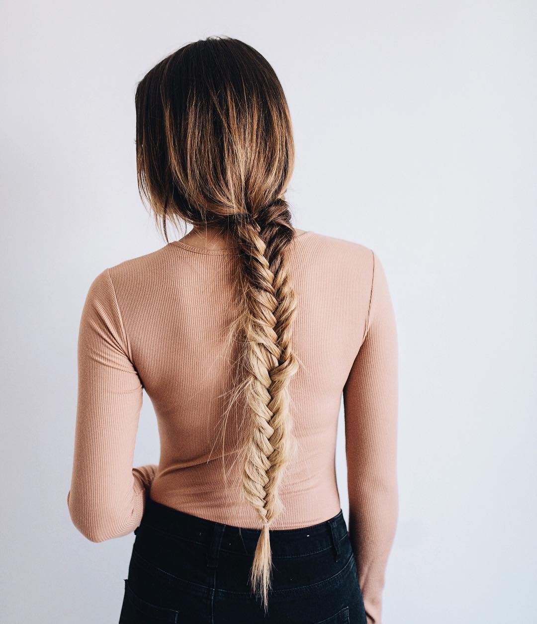 - Приближаясь к основанию шеи, заплести все оставшиеся пряди.