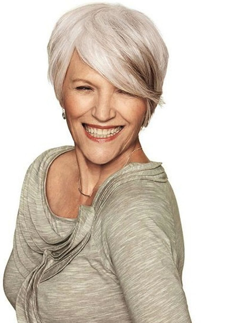 - Идеальные случаи: носите эту короткую светлую стрижку старше 50 лет во время прогулок и вечеринок.