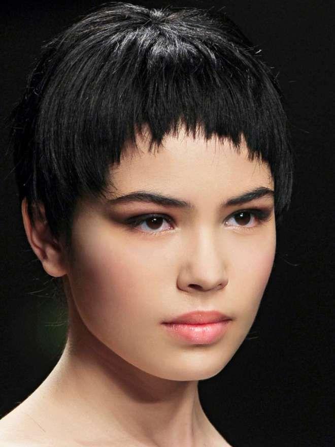 Если вы не хотите уделять много внимания уходу за волосами, то эта прическа для вас. Полностью открытое лицо и минимум неудобств. Короткая, едва заметная челка, возможно, с небольшим удлинением по бокам поможет скорректировать овал лица.