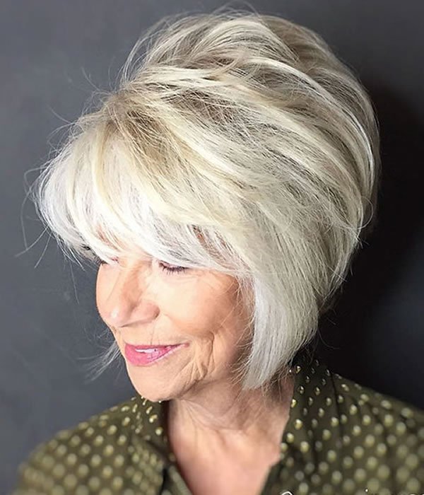 Вам нравится многослойность? Тогда эта стрижка может быть идеальным выбором для вас! Эта прическа — еще одна из многих коротких причесок для женщин старше 50 лет. Это короткий боб, а уложенные слои волос придают окончательное сияние всему вашему образу. Вам решать, хотите ли вы покрасить его или оставить серым, любой из них будет выглядеть великолепно!