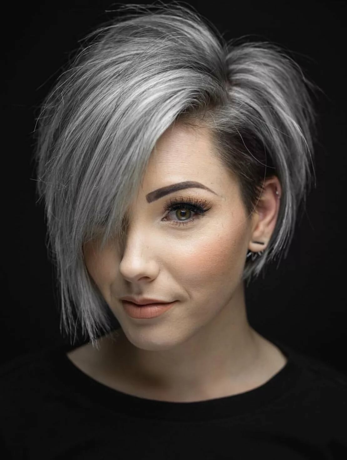 Сочетание стрижки пикси и косой строчки придаст вам элегантный и элегантный вид одновременно. Прямые волосы серого цвета с зачесанным сбоку скроют исходный объем прически. Вам следует очень хорошо расчесать волосы набок, чтобы получить эту прическу. Острые края прядей сделают вас заметным.
