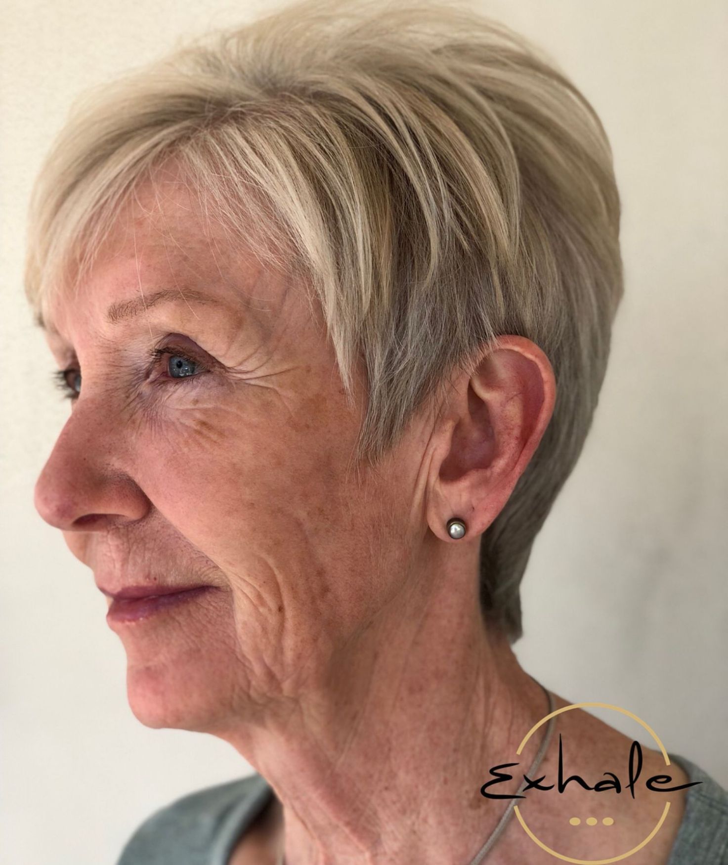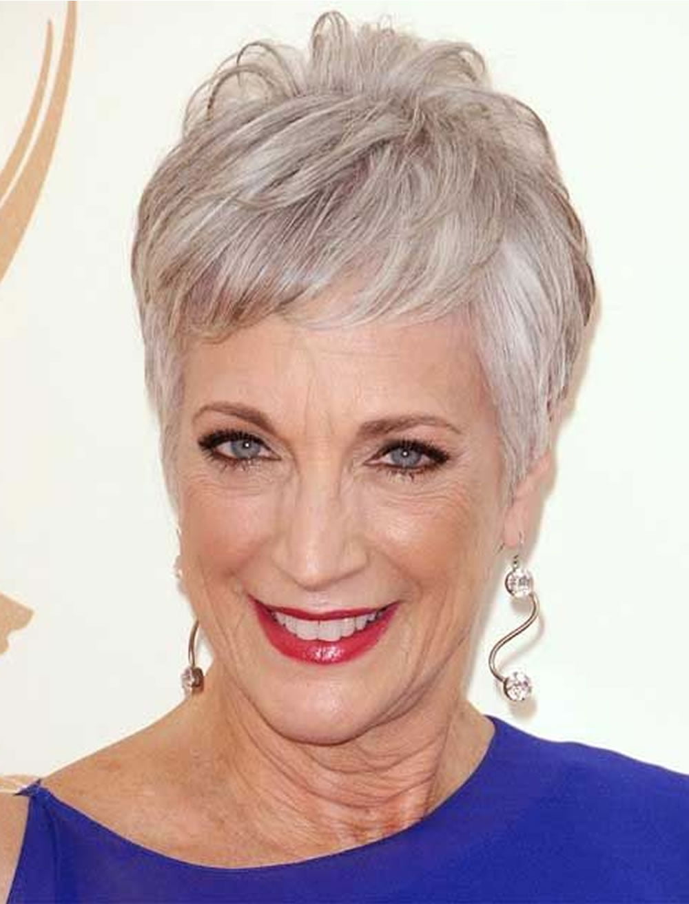 Женщинам после достижения шестидесяти лет, у которых стройная фигура и моложавость в чертах лица, будет хороша стрижка пикси или максимально короткая современная градуированная прическа. Это без усилий заметно на фотографиях. Она будет прекрасным выбором для обладательниц редкой и тонкой шевелюры.