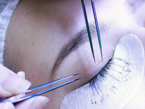 - Теперь начинается наращивание. При этом глаза должны быть закрытыми. Используя пинцет, мастер окунает искусственный волосок в специальный клей и крепит его к натуральному.