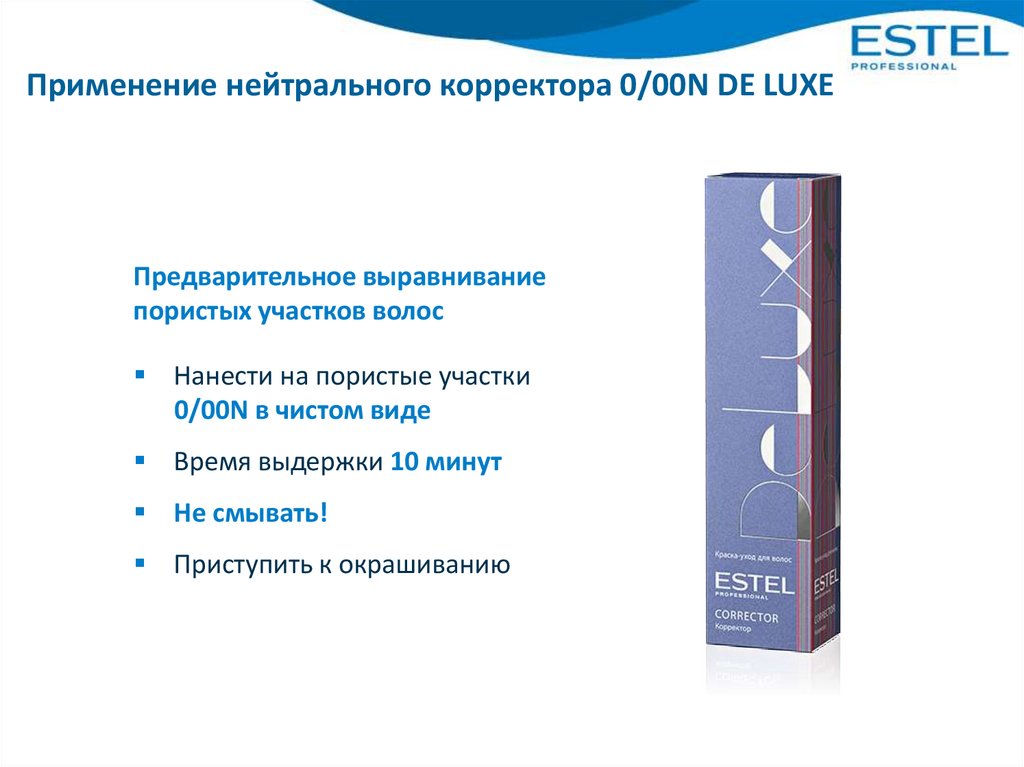 Нейтральный корректор может использоваться для усиления глянцевого эффекта, для дополнительного ухода и реконструкции окрашенных волос — создания глазурирования волос. Для этого на чистые влажные или сухие волосы средней длины нанести 30г корректора (не смешивая его с активатором или оксигентом). Выдержать 20 минут. По окончании времени воздействия тщательно смыть краску водой с использованием шампуня и бальзама Стабилизитор цвета DeLuxe.