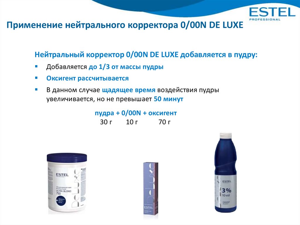 - Estel De Luxe Активатор 1,5% для интенсивного тонирования 60 мл. / Estel De Luxe Активатор 1,5% для интенсивного тонирования 1000 мл. / Estel De Luxe Активатор 1,5% для пастельного тонирования 1000 мл. / Estel De Luxe Оксигент 3% 60 мл. / Estel De Luxe Оксигент 3% 1000 мл.