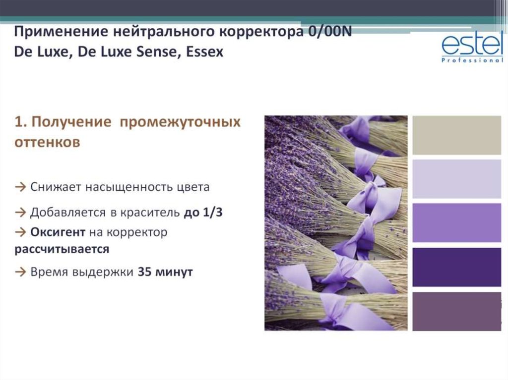 0/66, 0/55, 0/44, 0/33, 0/22, 0/11 цветные корректоры. С помощью цветных корректоров можно усилить яркость, интенсивность цвета, или нейтрализовать нежелательный цветовой нюанс.Рекомендуемые количества корректоров: 1 гр = 2 см