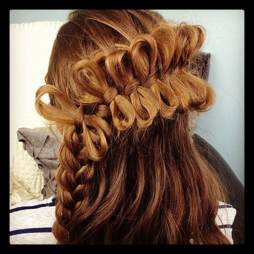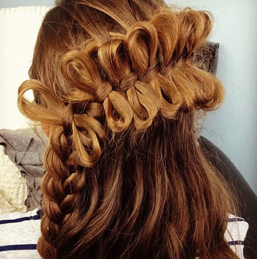 Для длинноволосых девушек вариантом нежной укладки станет заплетенная коса бантиками, идущая по горизонтальной линии на затылке. Все остальные волосы нужно накрутить на плойку и зафиксировать лаком.