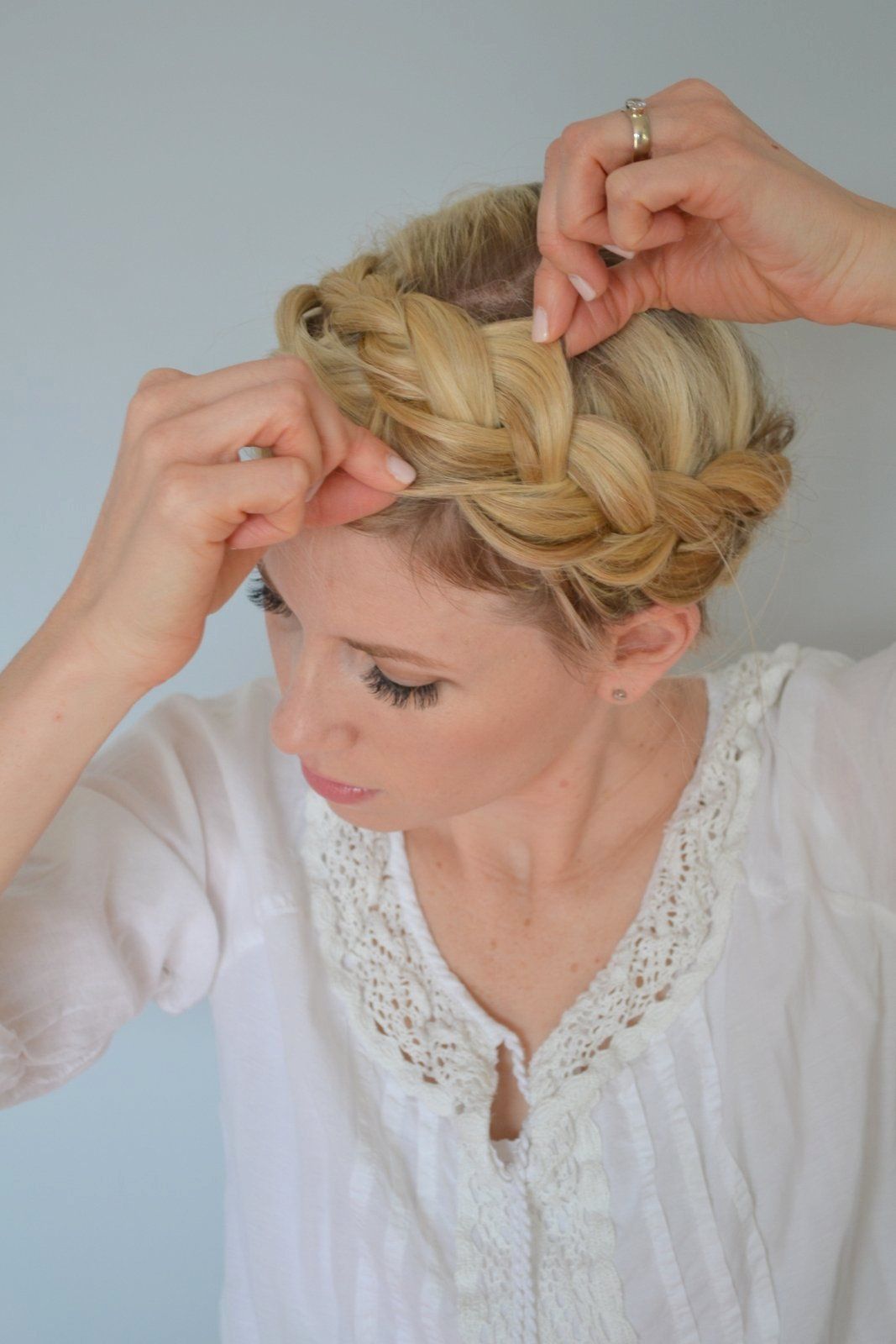 Вы можете создать эффект плетения, просто скрутив две пряди. Оберните их вокруг головы, как корону, и заколите концы в местах пересечения завитков.