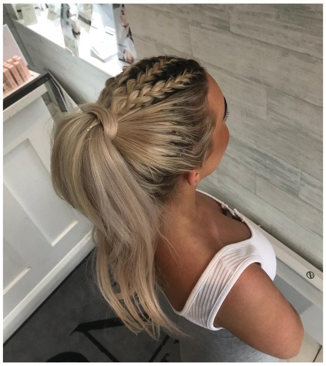 Одна французская коса идет ото лба до высокого хвоста. Оберните косу вокруг резинки конского хвоста, чтобы придать прическе законченный вид.