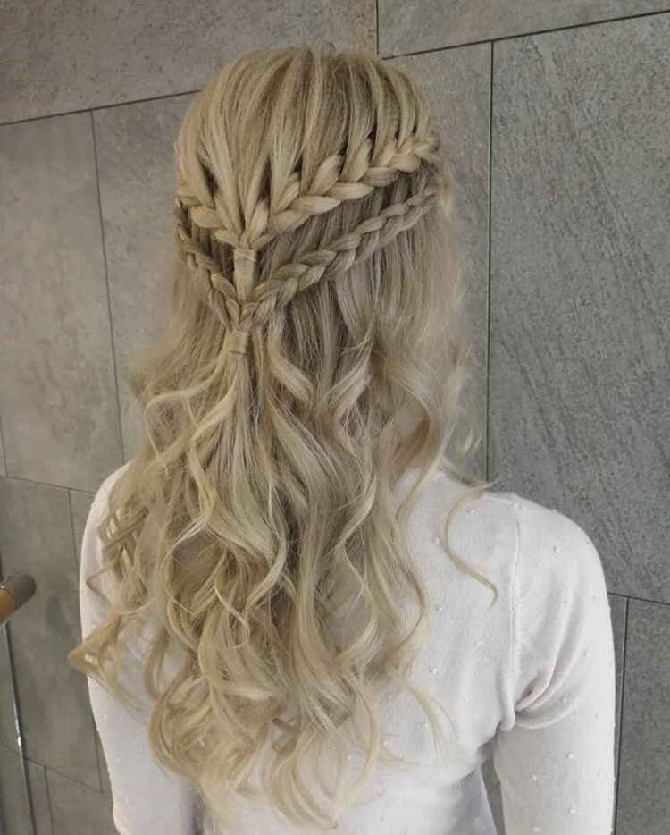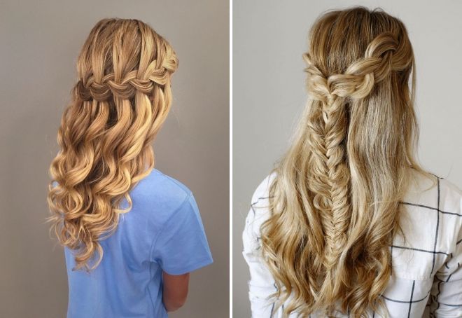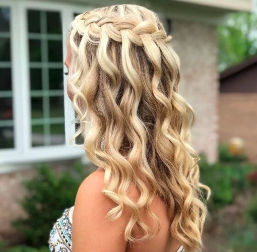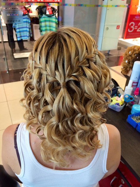 Название прекрасно отображает суть этой прически. Это вариация . Но вместо того, чтобы заключить все волосы в косу, часть прядей оставляют свободно ниспадать, тем самым проводя аналогию с падающими струями водопада. Такая прическа прекрасно дополняет нежные и романтичные образы. Она не так уж и сложна в исполнении и потрясающе смотрится на волнистых волосах длиной ниже плеч.