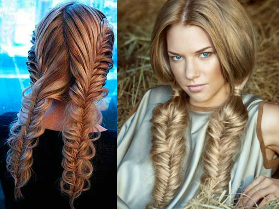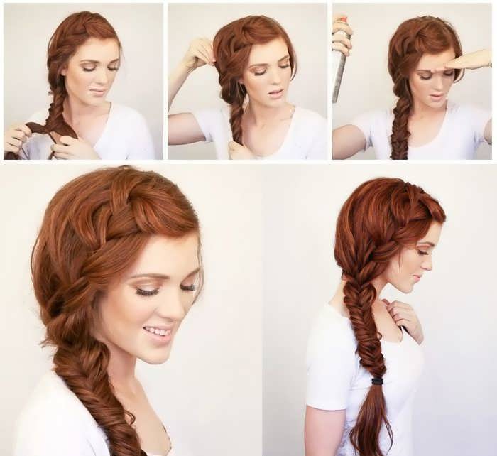 Шаг 7-9: Теперь все ваши волосы, включая незаконченную французскую косичку, закрепленную резинкой (ее можно убрать), возьмите в руку и разделите на две части. Где-то на уровне плеча начинайте плести косу рыбий хвост. Когда все волосы будут заплетены в рыбий хвостик, закрепите его резинкой. Для завершения нужно сбрызнуть прическу лаком. Чтобы коса смотрелась более объемно и свободной, слегка потяните за клинышки косички.
