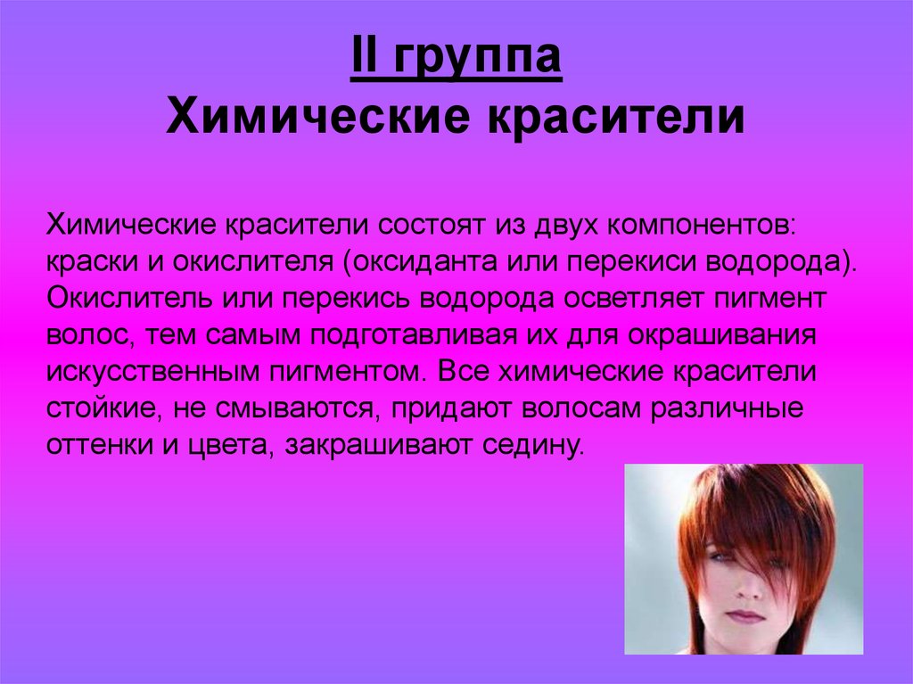 Естественные красители не наносят никакого ущерба волосам, наоборот, они придают естественному цвету волос блеск, шелковистость и различные оттенки, благодаря смешиванию некоторых препаратов. Основное преимущество красителей IV группы — сохранение красивых и здоровых волос.