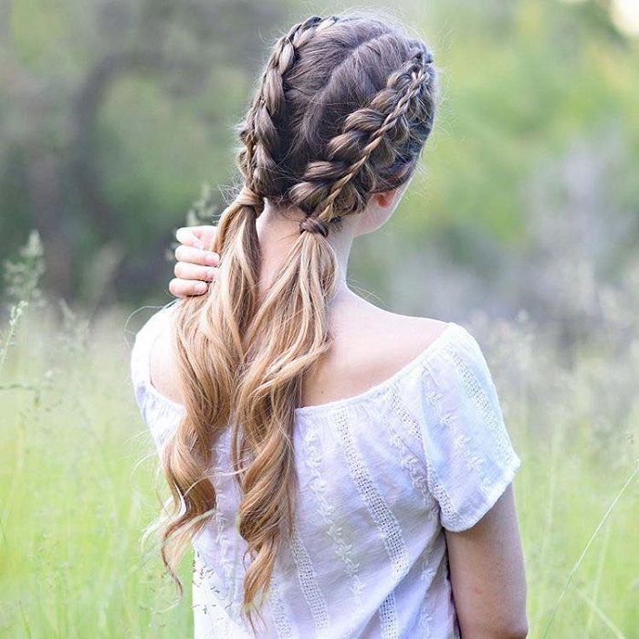 Прически с двумя косами можно носить для особых случаев. Этот был бы идеальным. Здесь у нас длинные и вьющиеся волосы с двумя маленькими косичками на верхней части головы. Это потрясающая прическа, и она отлично подойдет для выпускного вечера и для подружек невесты. Вы даже можете добавить в косы маленькие цветы или драгоценные камни для волос. Оба из которых можно купить в Интернете.