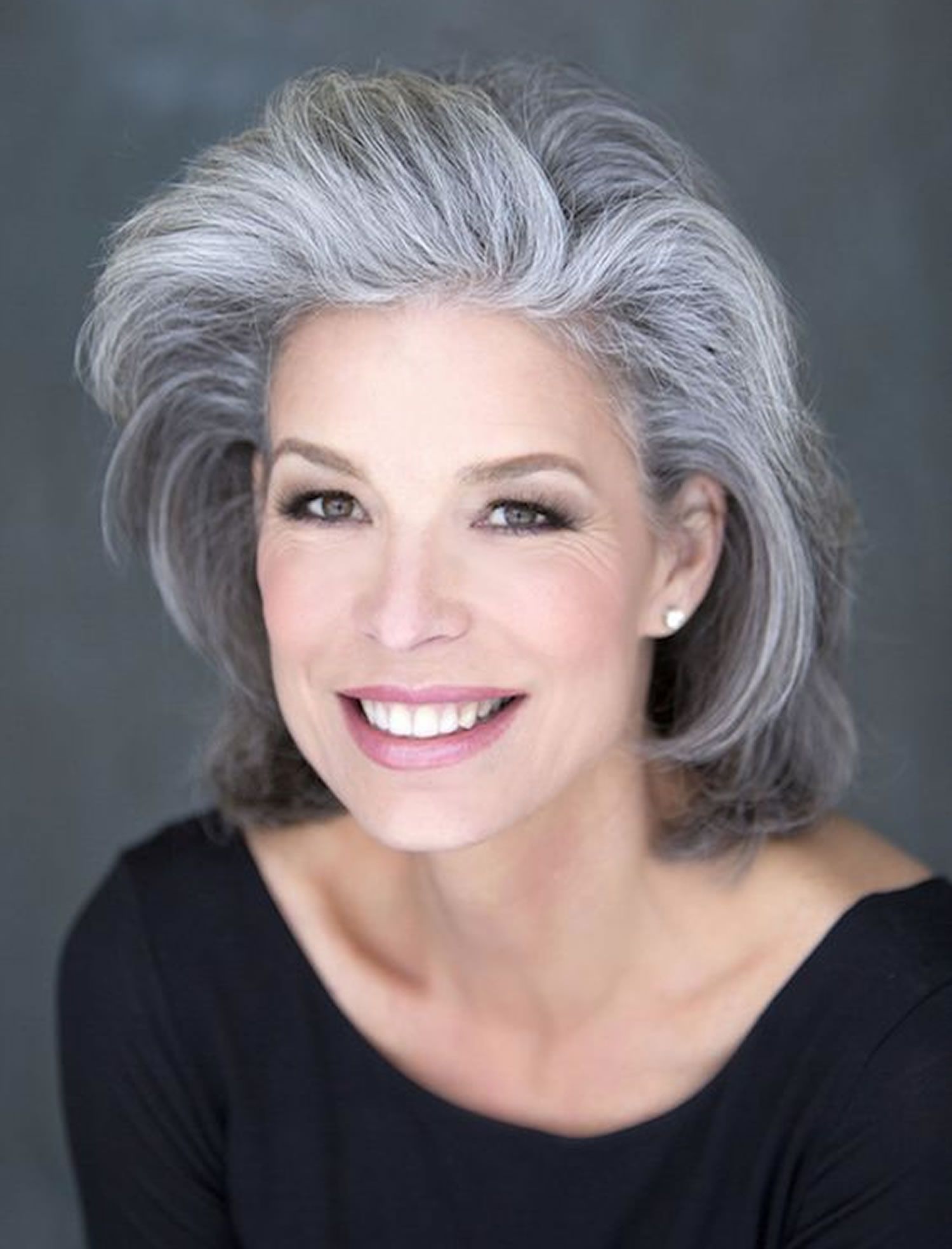 Здесь седые волосы работают как естественные блики на ее коричневых волосах, которые буквально являются целями для ваших волос в 50 лет.