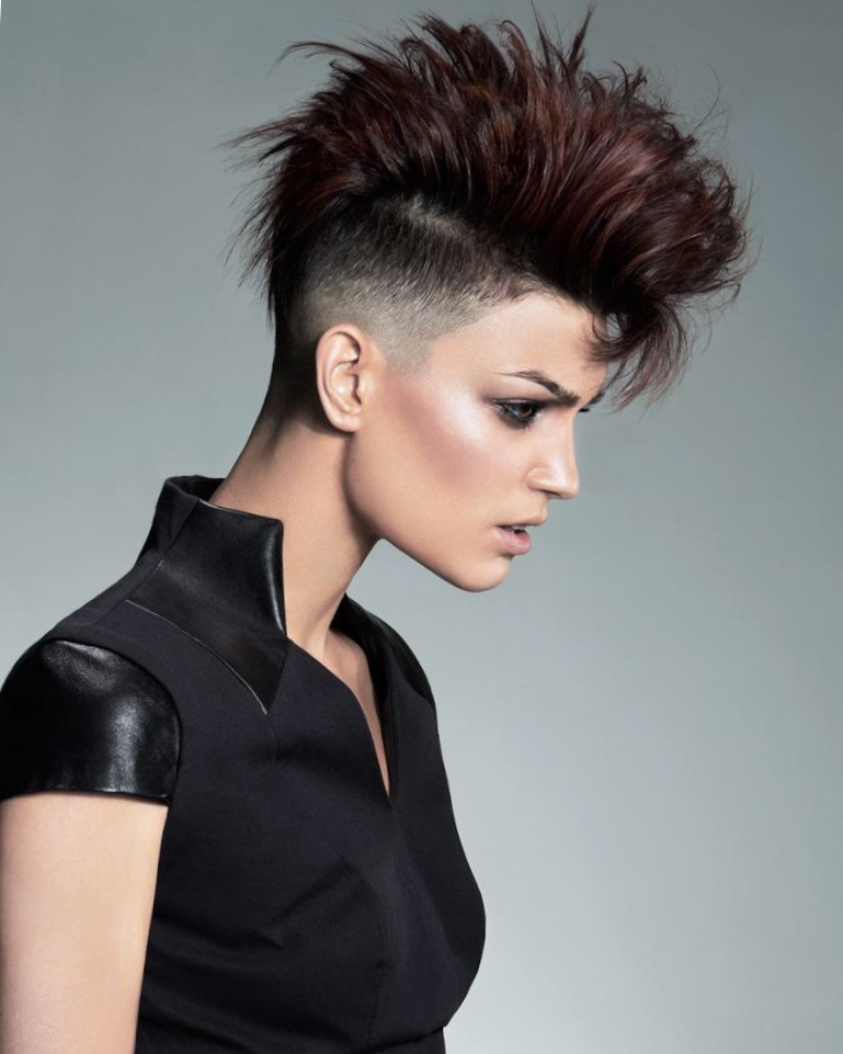 Креативные стрижки довольно экстремальны и сами по себе, поскольку далеко не каждая женщина решится так открыть лицо и шею. При создании стильного образа стрижка усложняется необычным окрашиванием, ирокезом, наличием или отсутствием челки.