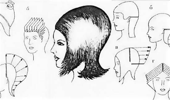 Есть и еще одна техника, предполагающая начало стрижки вверху. Тогда пряди в верхнем слою прочесывают по направлению лица и стригут приблизительно по черте носа. Затем аналогичные действия выполняют со следующим слоем, уже ориентируясь на подстриженные ранее пряди. Таким способом пошагово подстригают все слои. Эта схема выполнения предполагает, что самые короткие волосы находятся вверху, а самые длинные – в нижней части около зоны затылка.