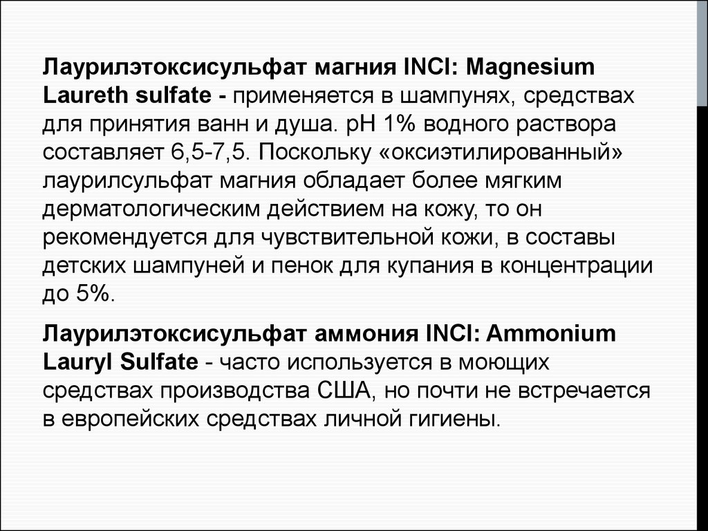 Sodium Myreth Sulfate и sodium myristyl ether sulfate — представляет собой смесь органических соединений используется как компонент моющих средств с поверхностно активными свойствами. Очень похож на СЛС. Умеренно опасен