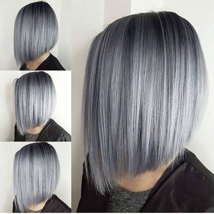 29. Серебряные блики и затухание корней. Выделитесь очаровательным серебристым цветом волос в сочетании с дымчато-серыми бэбилайтами. Корни оставлены темными для популярного «размера», которого хочет каждый клиент в наши дни.