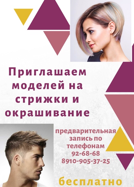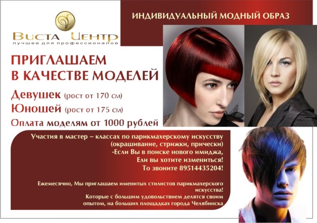 Стилист салона ищет моделей для мелирования и прикорневой ретуши. Услуга предоставляется по понедельникам в 14:00.