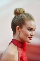 Прическа, как у Рози Хантингтон-Уайтли, точно не подходит на каждый день – уж больно гламурная. Тем не менее, создать ее вы можете самостоятельно. Соберите волосы в тугой низкий хвост. Скройте резинку прядью волос. Затем сформируйте из хвоста петлю и зафиксируйте все заколками.