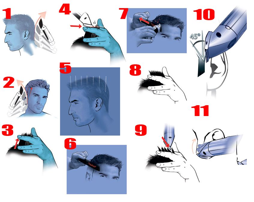 - Начните стричь с выбора необходимой насадки, затем, немного наклоняя машинку, начните убирать волосы на затылке, перемещая машинку как бы отталкивающими движениями. Если Вы только начинаете свои уроки мужской стрижки, то рекомендуется начать с крупной насадки, переходя к более мелким.